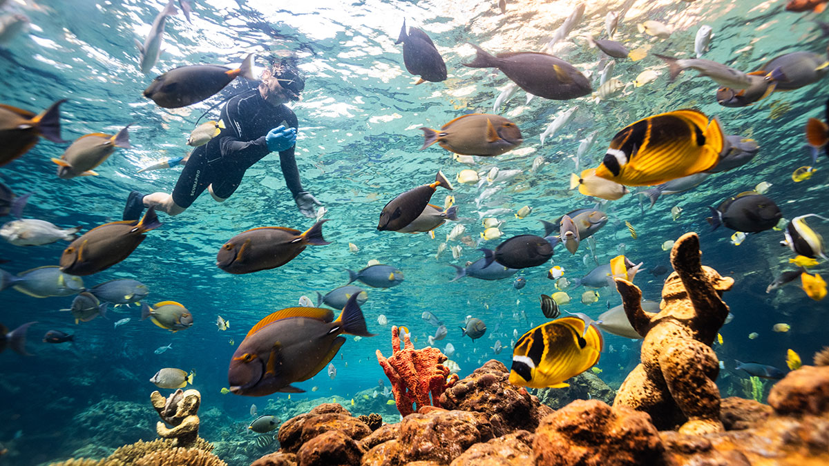 コ・オリナにあるディズニー・リゾート・アンド・スパ、アウラニのプールエリアでは、海水の珊瑚礁が昼前の日差しを受けてまぶしく輝いている。水面下では何百というハワイの熱帯魚たちが、彼らの生息地をそっくり再現したおよそ350平方メートルの珊瑚礁を優雅に行き来する。〈レインボー・リーフ〉とディズニーらしい名がつけられたこの珊瑚礁でゲストはシュノーケルを楽しみ、エンジェルフィッシュやサージョンフィッシュが描くカラフルな水中の景色を堪能する。ゲストに魅惑のひとときを提供する珊瑚礁は、魚たちが繁殖しやすい環境がととのっているため、アウラニの環境保護の取り組み上でも重要な役割を果たしている。